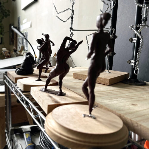 Relief sculptures and medallions developed through clay modeling, plaster, and then prepared for casting in bronze or ceramic materials.